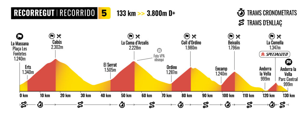 - El recorrido tendrá el tramo cronometrado desde Erts hasta el puerto de Cabús,el Serrat hasta la Coma de Arcalis, del Pueblo de Ordino al Coll d’Ordino, del pueblo de Encamp en La Collada de Beixalis, del pueblo de Sant Julià de Lòria hasta el alto de la Comella.
