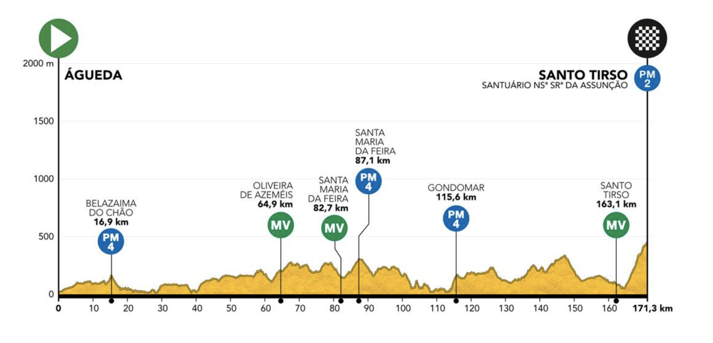 Tras la visita a la Serra da Estrela y a la región montañosa, sigue un lunes de descanso. El regreso a la carretera se produce el martes. Será la tercera etapa consecutiva con final coincidiendo con un premio de montaña, esta vez de segunda categoría, en la cima de Senhora da Assunção, Santo Tirso. La salida será en Águeda y el recorrido tendrá 171,3 kilómetros.