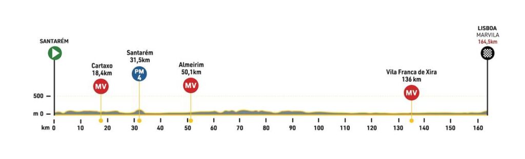 Se espera que la segunda etapa sea la primera oportunidad para los velocistas. Se trata de un recorrido de 164,5 kilómetros, con salida en Santarém y llegada en Marvila, en la ciudad de Lisboa, en el regreso de una etapa en línea a la capital, nueve años después de la anterior y en la que será la localidad más meridional de la edición de 2024.