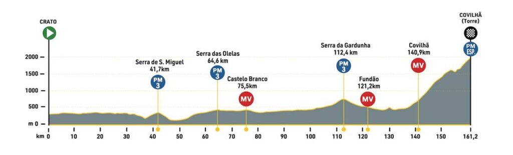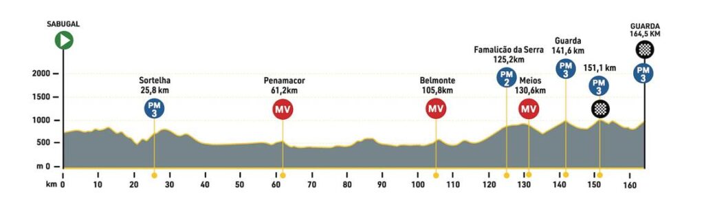 Al día siguiente, víspera de la jornada de descanso, el pelotón afrontará un carrusel de media montaña a lo largo de los 164,5 kilómetros que separan Sabugal de Guarda. Una subida de segunda categoría y cuatro de tercera (dos de ellas en la línea de meta, en el primer y segundo puerto) harán la vida muy dura a los corredores.