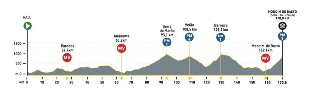 La penúltima etapa comienza en Maia y termina en Mondim de Basto, en la cima de Senhora da Graça, coincidiendo con un premio de montaña de primera categoría. Los 170,8 kilómetros incluyen las subidas de la sierra de Marão (km 93,1, 1ª categoría), Velão (km 108,5, 4ª categoría) y Barreiro (km 129,7, 1ª categoría), antes de la subida al Monte Farinha, donde termina la etapa.