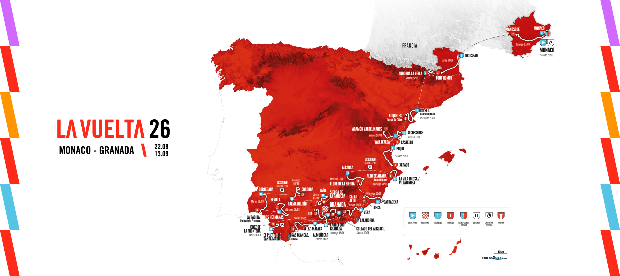 Una Vuelta que atravesará tres países más junto con Andorra, Francia -las dos únicas incursiones pirenaicas- y la obvia España con un dibujo prácticamente paralelo al retrasado y anhelado corredor mediterráneo ferroviario. Catalunya y Tarragona darán paso vía sureste a Comunitat Valenciana -con el salto al aragonés Valdelinares- Murcia, un único paso por Castilla-La Mancha en Albacete y Andalucía, que se lleva el premio gordo y el desenlace final con nada menos que diez fracciones, prácticamente la mitad del trazado diseñado por los codirectores técnicos Fernando Escartín y Kiko García. Un epílogo fuera de Madrid -inconcluso en septiembre por las protestas anti Israel- por la coincidencia del inédito GP de Madrid de Fórmula 1 -se han aliado ambos deportes- y que puede marcar las próximas ediciones si se siguen solapando las fechas. Ausente la clausura de Canarias por la negativa de Gran Canaria, se ha optado por un paseo por Granada, el día después del último final montañoso, el del Collado del Alguacil que puede ser el juez que decida el sucesor de Jonas Vingegaard.