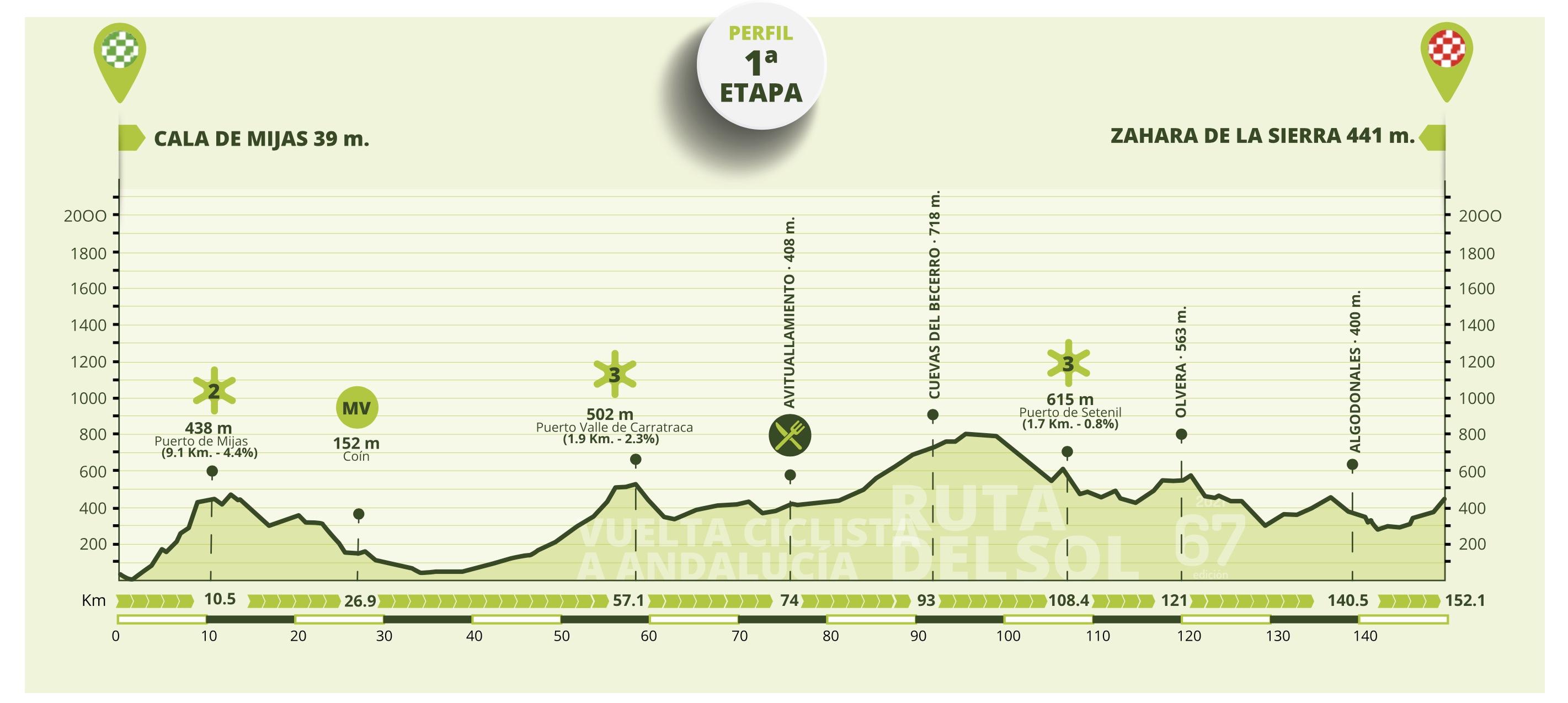 Esta Vuelta Andalucía-Ruta del Sol, que tiene la categoría de carrera internacional UCI ProSeries, acogerá un total de 807,6 kilómetros, por toda Andalucía, distribuidos en cinco etapas. Comenzará el martes, 18 de mayo, en la Cala de Mijas, recorriendo la provincia malagueña hasta llegar a meta en Zahara de la Sierra (Cádiz), con un recorrido total de 152,1 kilómetros. La etapa cuenta con un total de dos puertos de montaña: el Puerto de Mijas de 2ª categoría y el Alto de Carratraca de 3ª categoría.