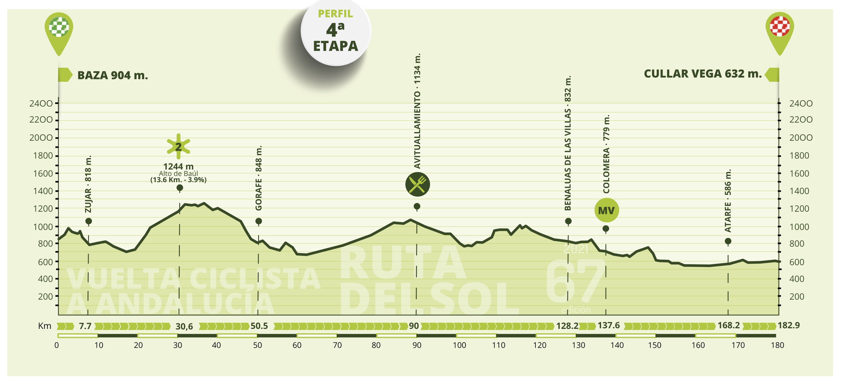 La cuarta etapa, el viernes 21 de mayo, comenzará en, Baza (Granada) y acabará en la localidad de, Cúllar Vega (Granada), con un total de 182,9 kilómetros. La etapa granadina cuenta con un puerto de 2ª categoría.