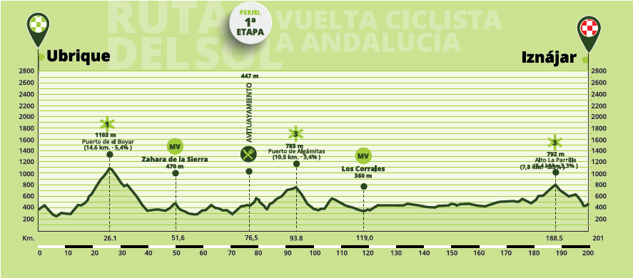 La primera etapa de la ronda andaluza dará comienzo en la localidad gaditana de Ubrique el miércoles 16 y tras más de 200 kilómetros acabará en Iznájar (Córdoba) en una llegada en cuesta que servirá para decidir el primer maillot de líder de la carrera. La serpiente multicolor discurrirá por cuatro de las ocho provincias andaluzas en esta primera jornada (Cádiz, Sevilla, Málaga y Córdoba). El día contará con cinco puertos de montaña, entre ellos El Boya de 1ª categoría. El último de ellos a escasos 12 km de una línea de llegada en cuesta que será muy parecida a la que vio alzar los brazos al español Gonzalo Serrano en la edición de 2020 de la prueba autonómica.