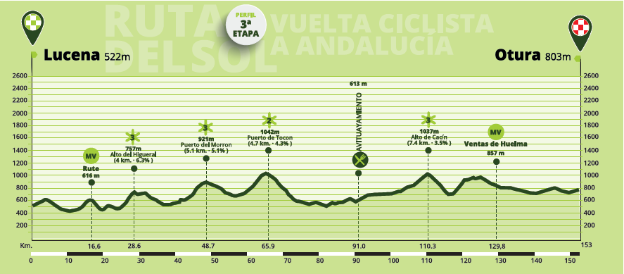 El viernes 18 de febrero, con un recorrido de 152 kilómetros y 600 metros, se disputará la tercera etapa de esta Ruta del Sol con comienzo en Lucena (Córdoba) y llegada en Otura (Granada). Se espera una etapa muy rápida perfecta para rodadores en la que se deberán pasar cuatro cotas puntuables, tres de 3ª categoría y una de 2ª en un final perfecto para los más rápidos del pelotón.