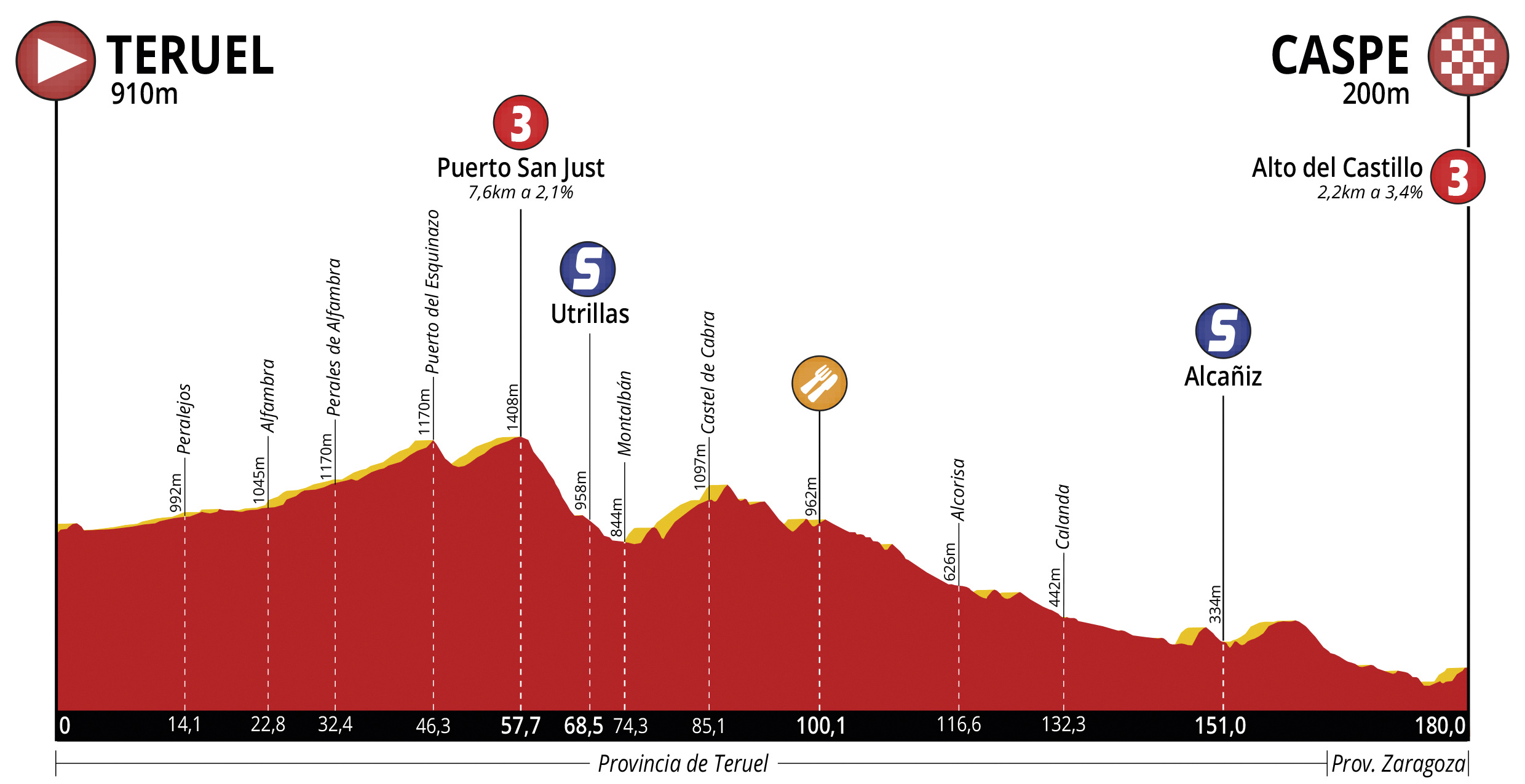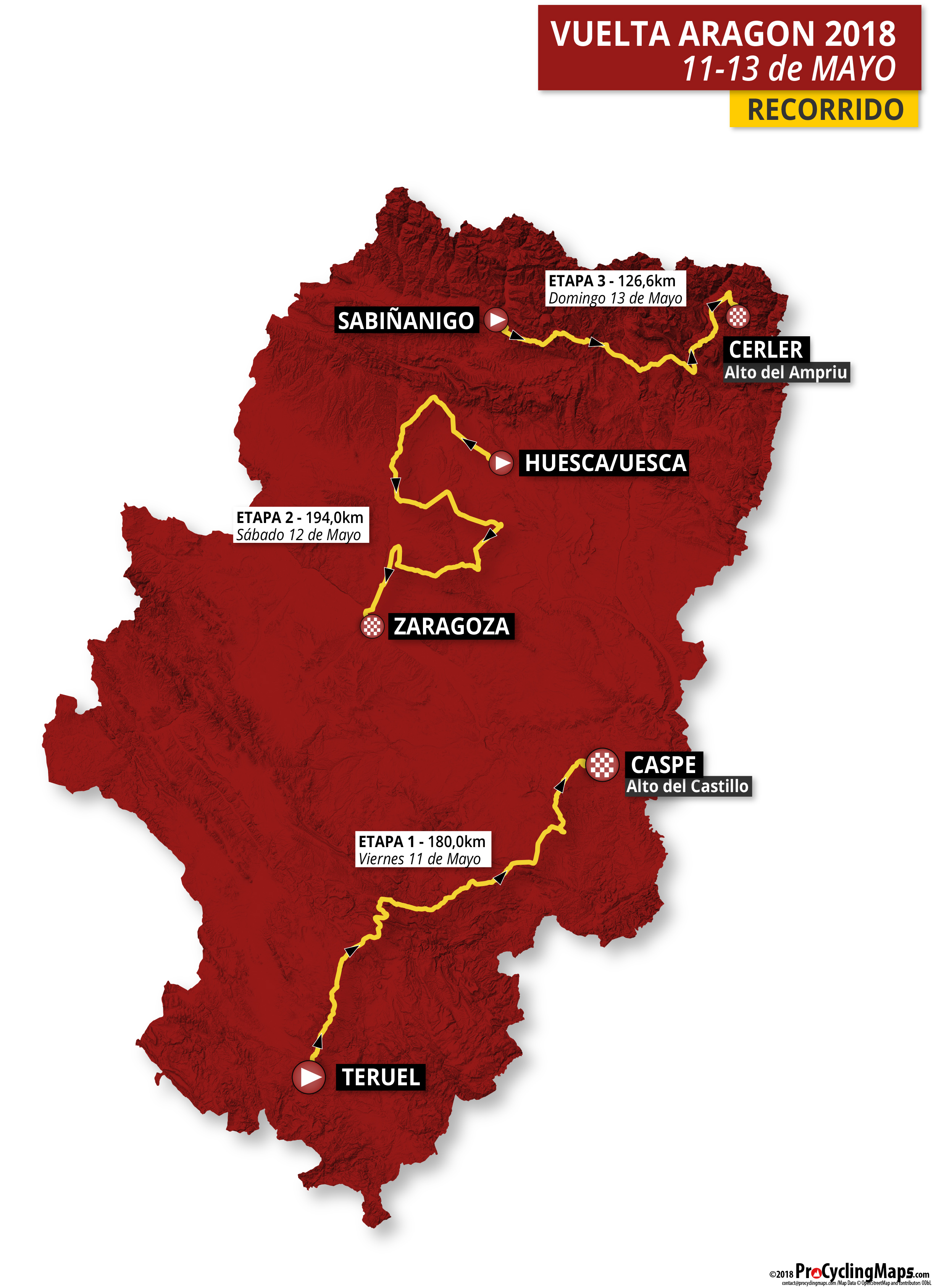Otra de las tres capitales, la meridional Teruel sería la encargada de acoger la primera jornada el próximo viernes 11 de mayo en dirección a Caspe, localidad natal y residencia del español con más arcoíris en la historia junto a Ros, Abel Mustieles y población muy activa en eventos ciclistas a cargo del CC Caspolino, que alberga una prueba de la Copa de España femenina o la Vuelta al Bajo Aragón de cadetes.