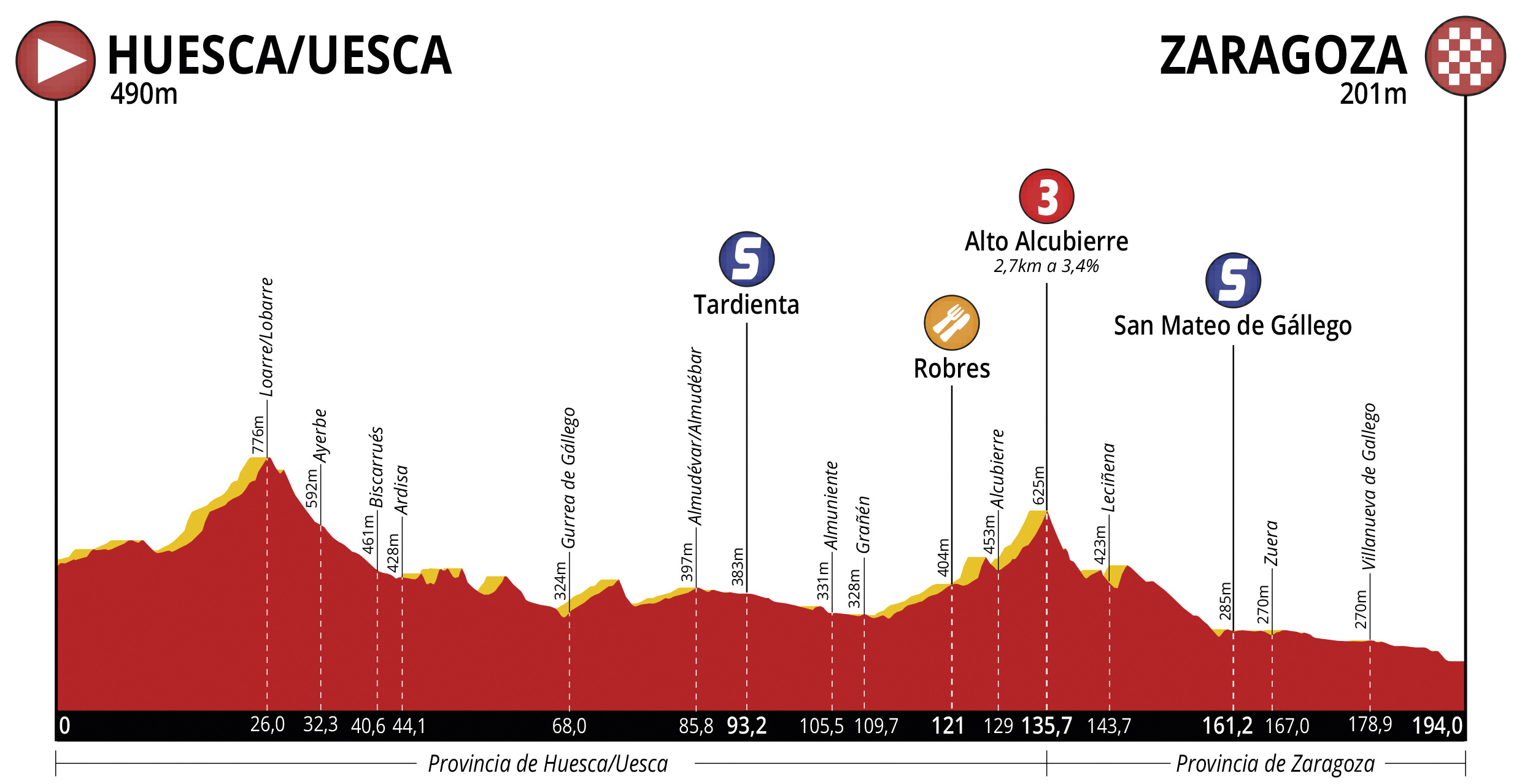 Los velocistas tendrán su primera y única oportunidad con motivo de la segunda etapa que, con un trazado de 170 kilómetros, unirá Huesca con Zaragoza, en cuyas calles se espera que el triunfo se decida al sprint.