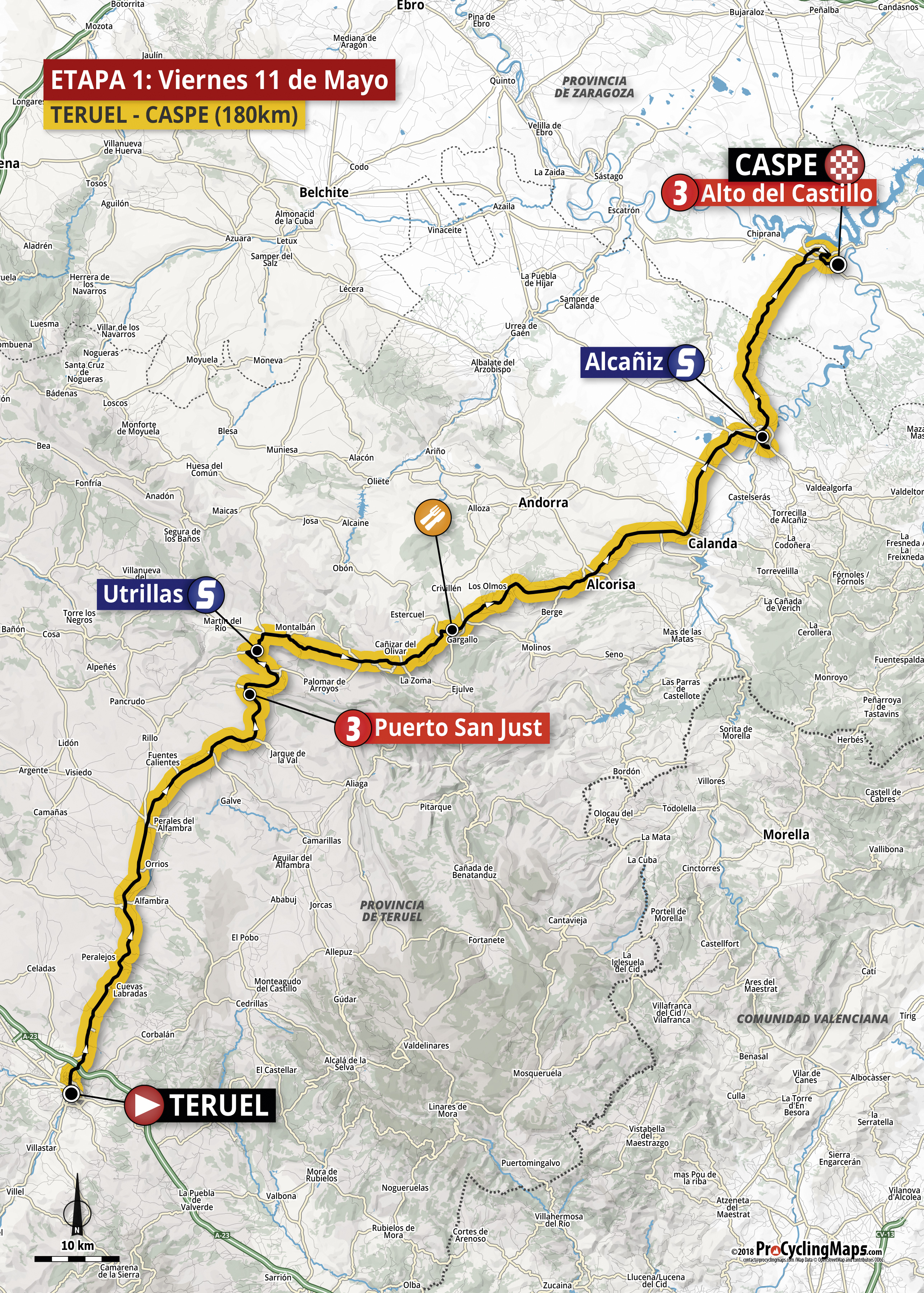 Teruel será, el día 11 de mayo, punto de partida inicial de esta renacida Vuelta a Aragón que arrancará con una etapa en línea de 184 kilómetros con final en el Alto del Castillo, una meta que convertirá esta etapa inaugural en un día muy importante ya que obligará a los aspirantes a la general a dejarse ver a las primeras de cambio.