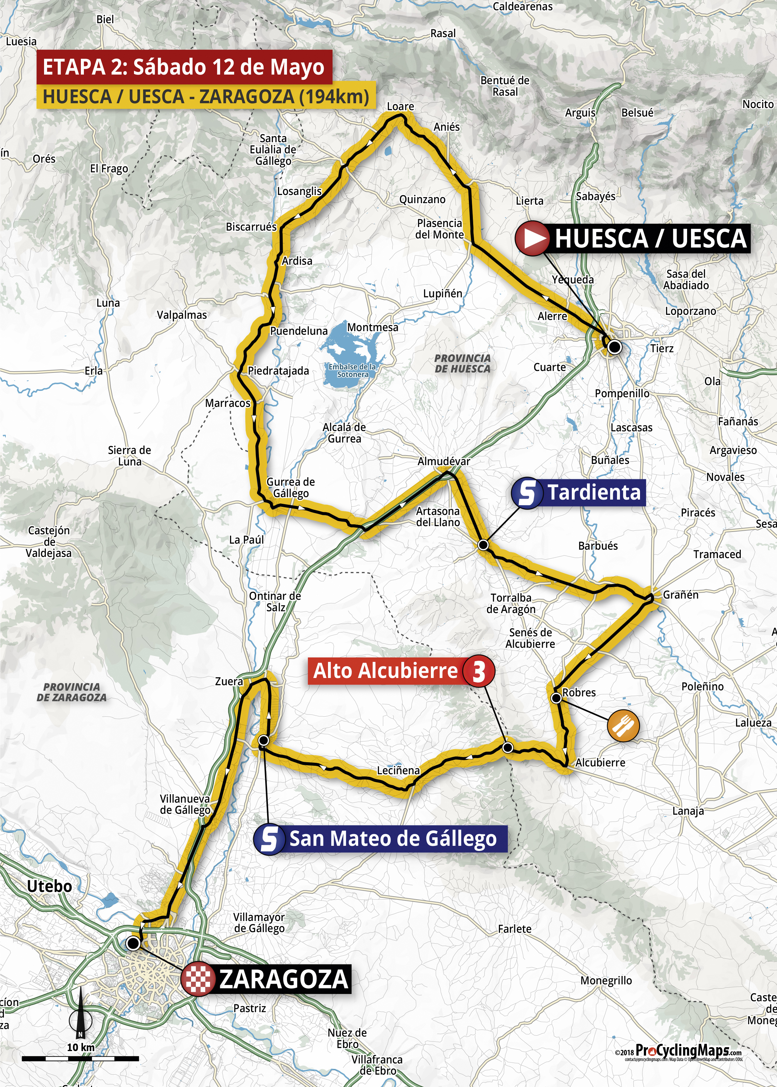 Las incógnitas se centran en la segunda jornada, el sábado 12 de mayo -que también podría salir de Caspe-, para llegar a algún punto de la provincia de Huesca y un posible final en alto, barajándose la alternativa de Cerler-Ampriu. Mientras, todo parece apuntar que la ciudad de Huesca sería el punto de partida de la etapa final rumbo a Zaragoza ya el domingo 13 de mayo para conocer al sucesor de Rubén Plaza -activo en 2018 con el Israel-, último vencedor en 2005.