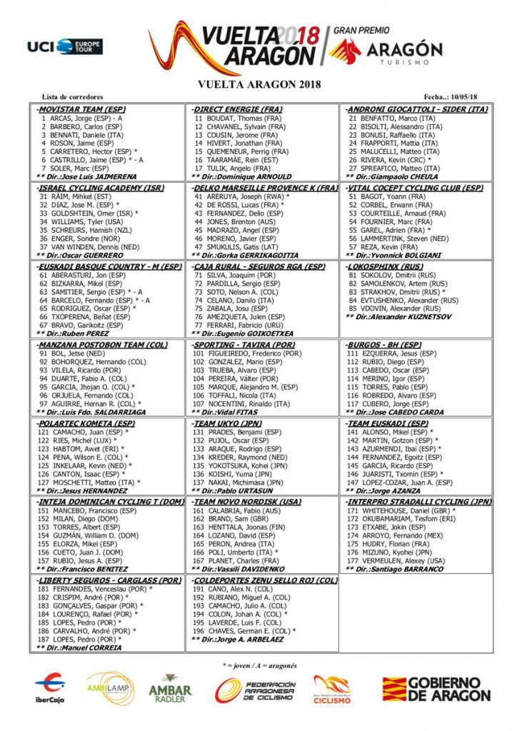 Jorge Arcas y Jaime Castrillo (Movistar) y Fernando Barceló -vigente campeón aragonés sub-23- y Sergio Samitier (Euskadi) son los aragoneses profesionales que podrían tener la ocasión de poder competir en una autonomía huérfana de pruebas de la máxima categoría, excepción hecha de las etapas de la Vuelta a España.