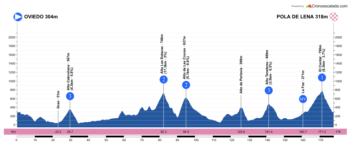 Al igual que en la anterior edición, la primera de las etapas saldrá de Oviedo y llegará a meta en Pola de Lena. Una «clásica» por los valles mineros con un kilometraje muy respetable (181km), y un sinuoso recorrido «rompe piernas», con 5 cotas puntuables: Alto Cabruñana (3ª), Alto de las Estacas (2ª), Alto de las Cruces (2ª), Alto del Tenebreo (3ª) y El Cordal (1ª).
