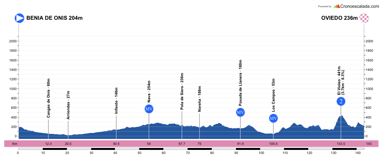 La tercera y última etapa con salida en Benia de Onís, tradicionalmente más corta (140 km), contará con una una dificultad montañosa puntuable, El Alto del Violeo (2ª), que se iniciará a 9 km del final en la Calle Uría de Oviedo.