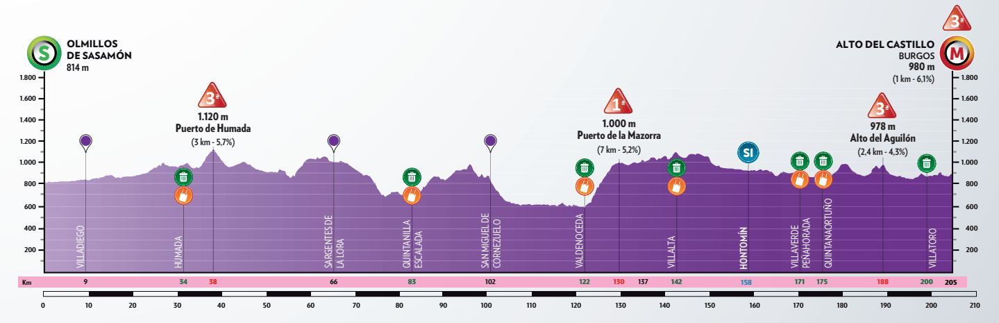 La Vuelta a Burgos se pondrá en marcha el martes 5 de agosto con una etapa de media montaña de 205 kilómetros, la más larga de esta edición, que arrancará en Olmillos de Sasamón y concluirá en el Alto del Castillo de Burgos. El Puerto de la Mazorra, ascenso de 1ª categoría, perfilará la primera gran batalla de la carrera.