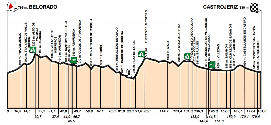 La primera jornada, de 181 kilómetros entre Belorado y Castrojeriz, pasará por tres subidas puntuables: el Alto de Valmala (2ª categoría), el Puerto de Altotero (1ª) y el Alto de Coculina (3º), situado a 50km de la llegada. La segunda etapa transcurrirá entre Fromista y Villada con 170.3km y el Alto de Magú (3ª) como única dificultad del día en el tramo inicial. Y la tercera y última fracción, de 151.8km entre León y Villafranca del Bierzo, se antoja la más dura con el Alto de Foncebadón (2ª) y el Alto de Onamio (3ª) a mitad del recorrido.
