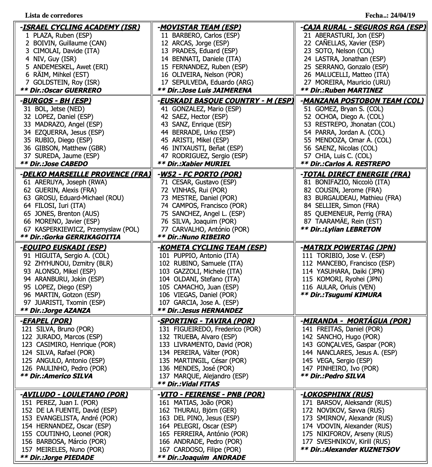Movistar, Miranda, Israel -con el dorsal 1 Plaza-, Fundación Euskadi, Euskadi-Murias, Burgos, Caja Rural, Kometa, Total, Delko, Ràdio Popular, W52, Efapel, Ludofoods, Sporting Portugal, Vito, Postobón y Lokosphinx son los equipos participantes.