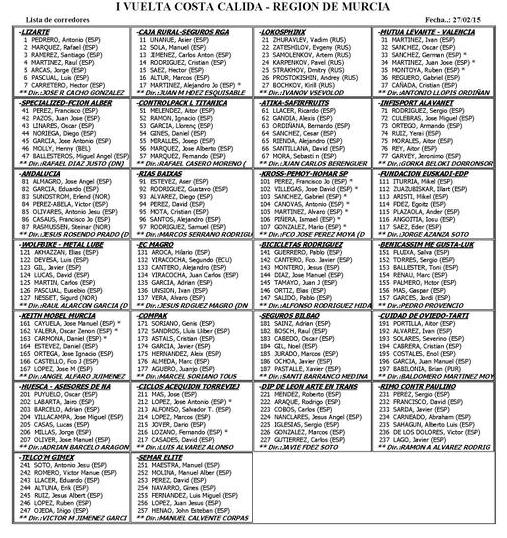 1º CAJA RURAL-SEGUROS RGA ESP 08:09:57 2º COMPAK ESP 08:09:57 3º SPECIALIZED-FCION ALBER ESP 08:09:57 4º BICICLETAS RODRIGUEZ ESP 08:09:57 5º SEGUROS BILBAO ESP 08:09:57 6º FUNDACION EUSKADI-EDP ESP 08:09:57 7º LOKOSPHINX RUS 08:09:57 8º LIZARTE ESP 08:09:57 9º TELCO'M GIMEX ESP 08:09:57 10º INFISPORT ALAVANET ESP 08:09:57 11º RIAS BAIXAS ESP 08:09:57 12º MUTUA LEVANTE - VALEN ESP 08:09:57 13º CONTROLPACK L TITANICA ESP 08:09:57 14º KROSS-PEMOY-NOMAR SP ESP 08:09:57 15º ANDALUCIA ESP 08:15:05 16º ATIKA-SAFIRFRUITS ESP 08:15:07 17º DIP DE LEON ARTE EN TRANS ESP 08:15:27 18º RIMO CONTR PAULINO ESP 08:21:18 19º WOLFBIKE - METAL LUBE ESP 08:21:18 20º EC MAGRO ESP 08:26:54 21º BENICASSIM ME GUSTA-LUK ESP 08:26:59 22º SEMAR ELITE ESP 08:27:01 23º KEITH MOBEL MURCIA ESP 08:31:05 24º HUESCA - ASESORES DE NA ESP 08:31:10 25º CUIDAD DE OVIEDO-TARTI ESP 08:32:31
