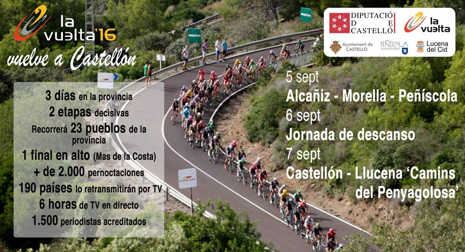 La última noticia es la confirmación de los finales de las 16ª y 17ª etapas que tendrán como escenario la provincia de Castellón, como ha presentado hoy su Diputación de manos de su presidente Javier Moliner. La primera jornada -que parte de la turolense Alcañiz el 5 de septiembre- finalizará en Peñíscola. Al día siguiente, 6, será la segunda jornada de descanso y el 7 de septiembre la etapa íntegra castellonense con salida en la capital de La Plana y meta en el duro Mas de la Costa, en el término de Llucena de Cid-Camins del Penyagolosa. El recorrido será Castellón-Desert de Les Palmes-Alto de la Coma-La Pobla Tornesa-Cabanes-Torre d’en Domenech-Sarratella-Albocàsser-Benassal-Culla-Atzeneta-Les Useres-Costur-Figueroles-Lucena del Cid y final de etapa en el Alto Mas de la Costa. Una subida de 4 kilómetros con un porcentaje medio del 12,4% de desnivel y picos máximos del 22% en su rampa final.