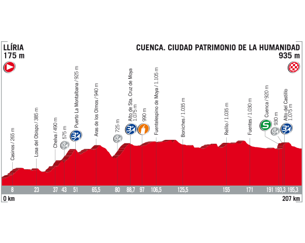 Antes llega el viaje entre Llíria y Cuenca, de 207 kilómetros, con el Alto del Castillo a 12 kilómetros del final, perfecto para otra fuga numerosa como la de hoy y para -quién sabe- vivir la primera victoria española de la presente edición, tras los palos de los jóvenes Soler y Mas. David de la Cruz, que volvió a sufrir y cedió unos segundo en meta, sigue siendo el último en lograrlo el año pasado en el Alto del Monte Naranco.
