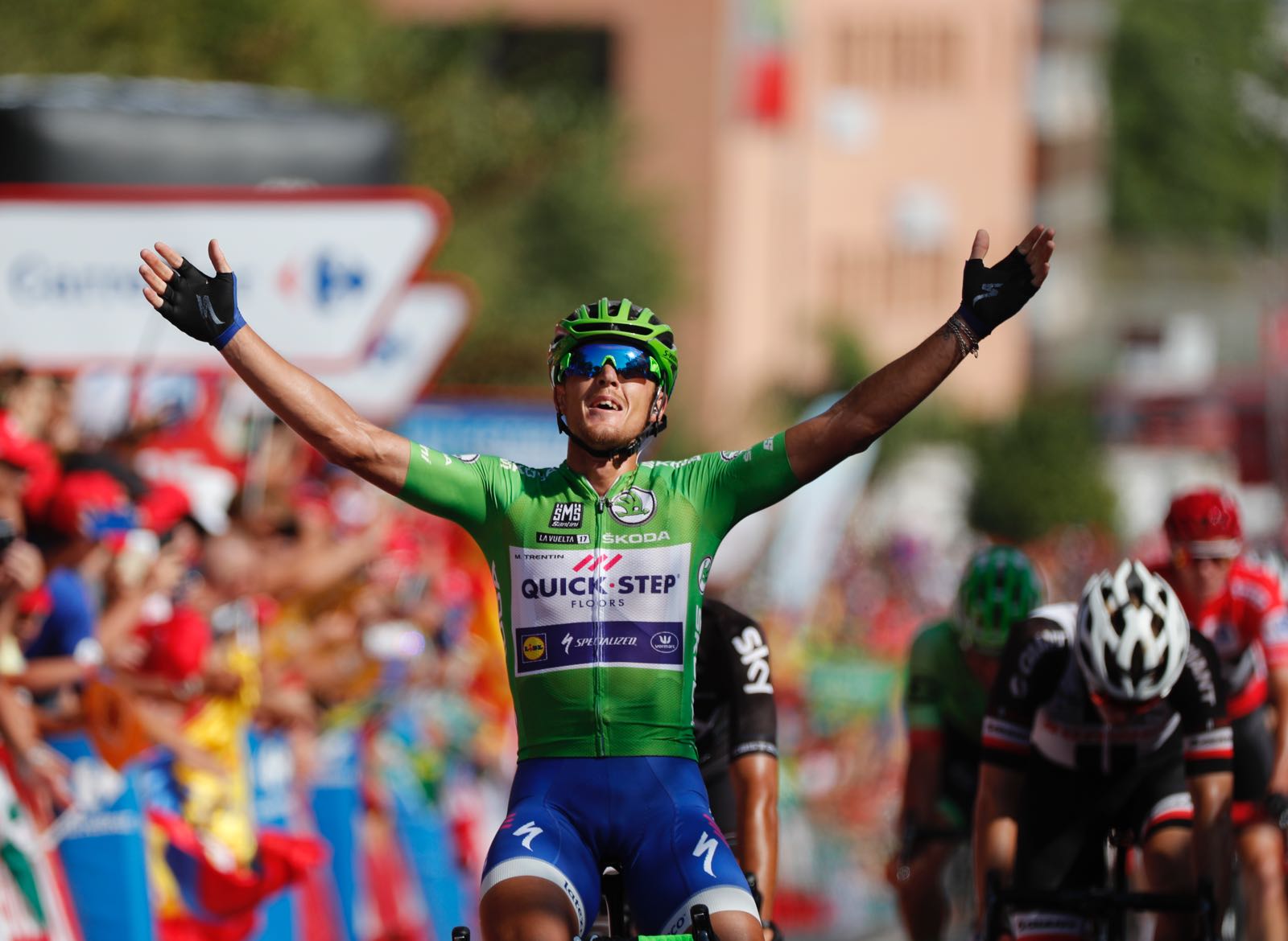 La cosa se puso seria a falta de 7 kilómetros para el final, momento en el que fue neutralizado De Marchi y el pelotón se dispuso para el sprint final. Quick Step, con un Alaphilippe potentísimo en la parte más empinada, preparó la llegada perfectamente bien para que Matteo Trentin, el gran dominador de los sprints en esta Vuelta a España, se llevase el que es su tercer triunfo en lo que va de carrera.