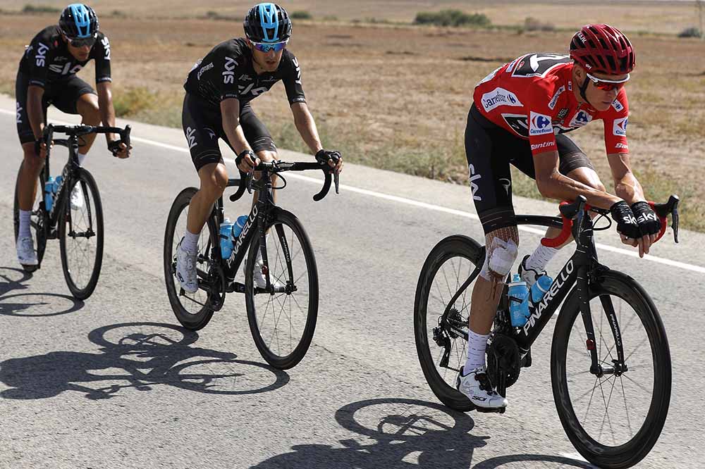 El líder de la carrera, Chris Froome, ha mostrado hoy una versión mucho mejor que la de ayer en Los Machucos, donde su debilidad en la parte final de la subida despertó dudas sobre su estado real de forma. Hoy, en las diversas entrevistas que concede el líder diariamente al finalizar la etapa, el británico ha repetido en más de una ocasión que el final de ayer “fue muy duro”. Preguntado si esa dureza venía dada únicamente por el terreno o si, además, había un factor propio, el de Sky ha reconocido que “tal y como ya dije, íbamos a pagar el esfuerzo de la contrarreloj de Logroño. Ayer, en Los Machucos, no estaba al cien por cien y pagué por ello, pero hoy he demostrado que me he recuperado bien y que todo vuelve a estar bien”.