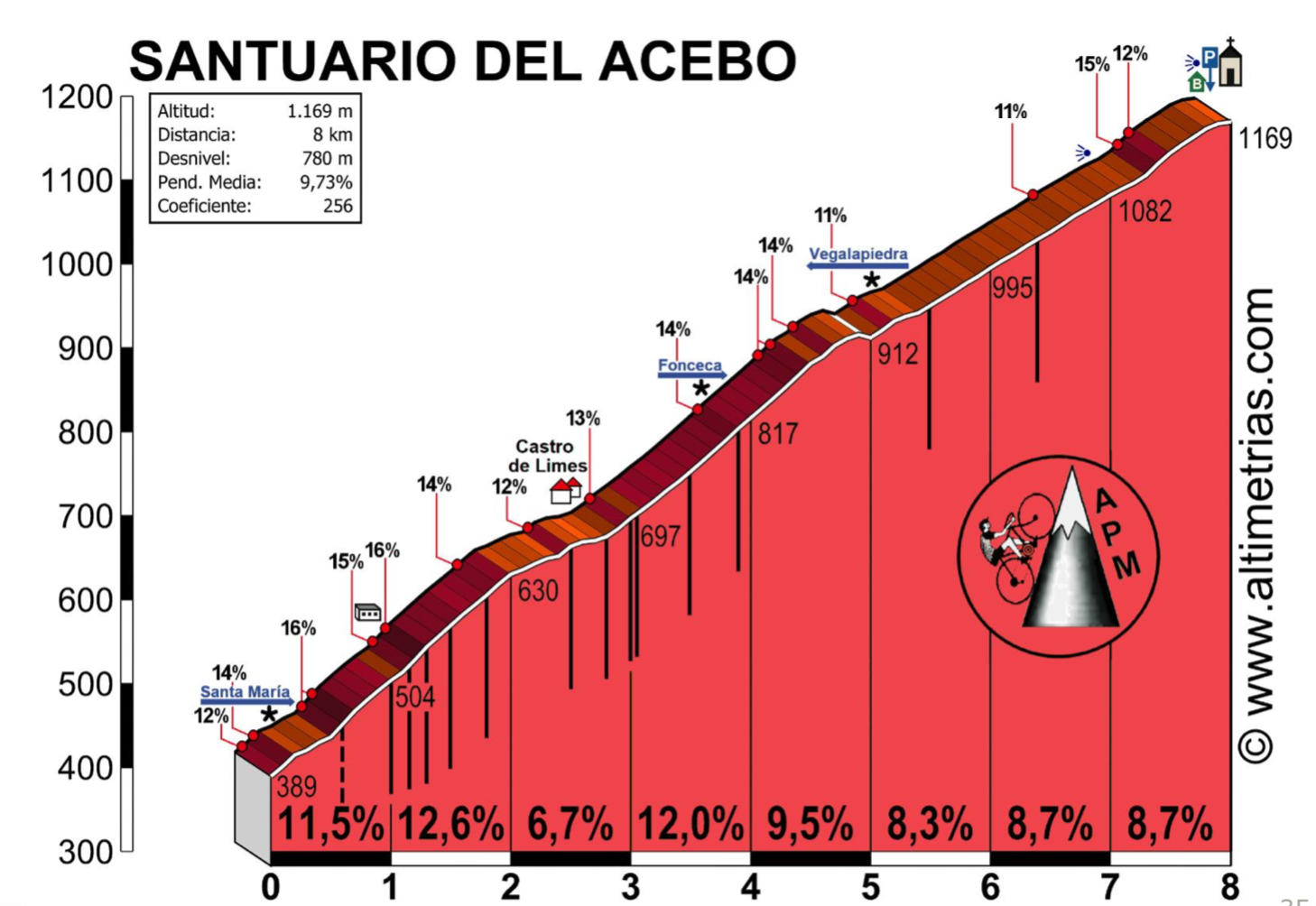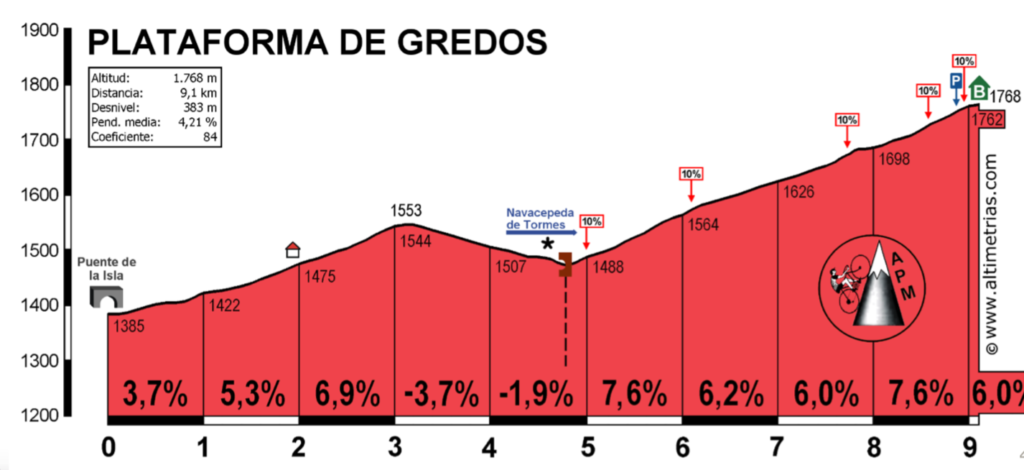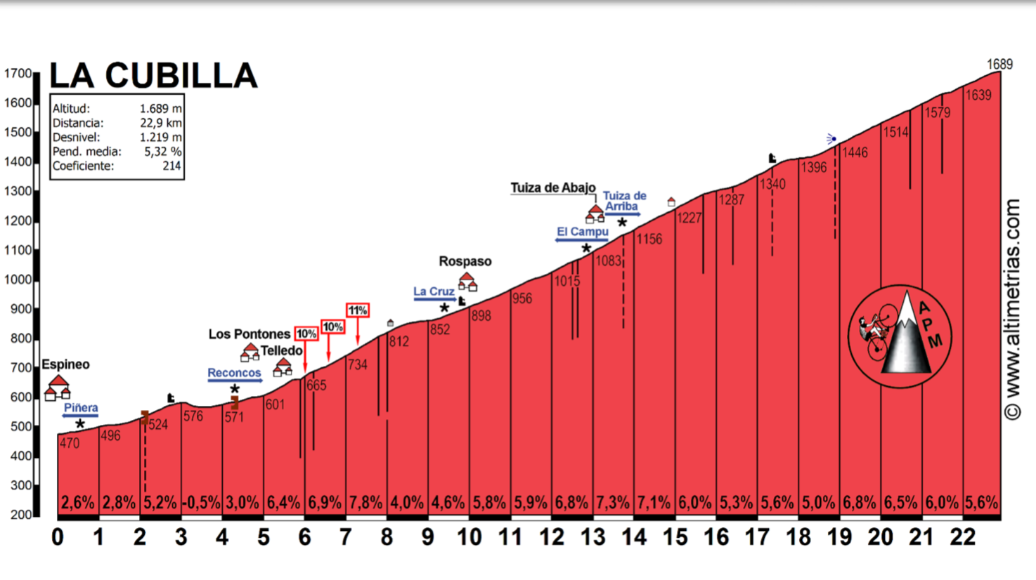Análisis de Óscar Cabedo (profesional del Burgos): «Tiene mucha más chicha que Ares. Lo fui a ver cuando vino la Vuelta a España la primera vez y la semana pasada. Es durísimo con una pendiente media del 12, pero porque tiene descansillos. Las rampas duelen de verdad. El mejor tiempo creo que es de 16 minutos por lo que no es largo, pero sí muy muy duro. Ahí montaremos un plato de 36 y un 28 o 30 de piñón. Son puertos que no da para ir demasiado deprisa ni poder hacer grandes ataques por esas rampas».