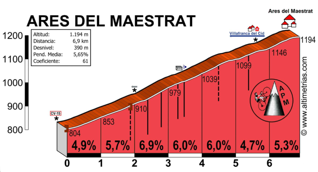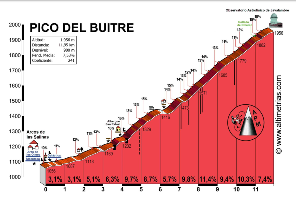 Análisis de Rafa Mora (periodista): «Un puerto de 11 kilómetros, sorprendentemente duro, pese a que los números ya lo indican. Salva un desnivel de casi mil metros (de los 1.000 de Arcos de las Salinas, a los 2.000 de la cima) y empieza avisando. Desde la salida del pueblo, asfalto nuevo y perfecto hasta la cima, rampas cortas pero duras que se van prolongando, hasta que desaparece todo menos la pendiente. Dejas de escuchar la bajada de agua del costado izquierdo. Dejas de ver árboles. Aparecen los cactus. Desierto extremo y rampas infernales, sin tregua ni descanso alguno excepto en el kilómetro 5, cuando un descenso te avisa para que tomes aire, porque queda todo. Rampas del 11%, del 12, del 13… duro de verdad».