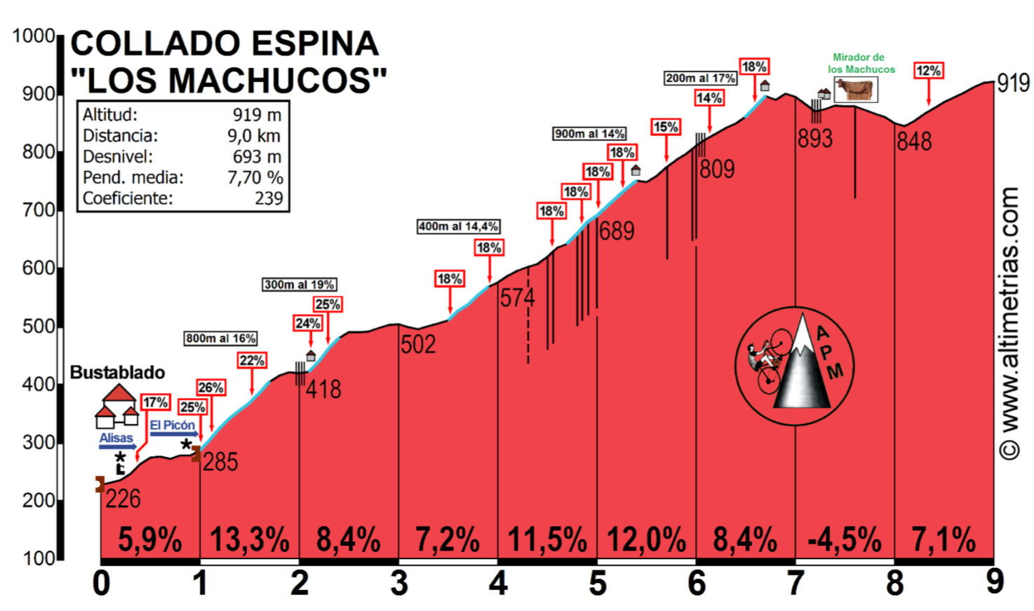 Análisis de Nicolás Van Looy (Ciclo 21): «Construida con el único fin de permitir el paso del ganado y algunas mercancías de un valle a otro sin tener que dar un inmenso rodeo, sus pendientes y sus tramos de asfalto precario y cemento catapultaron a Los Machucos, hace ya dos años, a la fama ciclista. No se trata de un puerto alto, con sus poco menos de 900 metros, pero sí de un muro durísimo, casi insalvable. Además, a sus rampas excesivas, que llegan a superar en algunos puntos el 26%; se unen tramos de cemento rayado –para que el ganado no resbale en los habituales días lluviosos– que agarra de forma inmisericorde y hace la ascensión todavía más complicada. Todo ello, todavía más difícil si, como en 2017, el día no es propicio y hace aparición la lluvia. En el otro lado de la balanza, aunque es poco consuelo, hay que indicar que cuenta con algunas zonas de falso llano e incluso cortas bajadas que permiten tomar algo de aire».