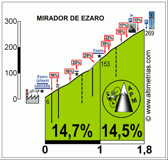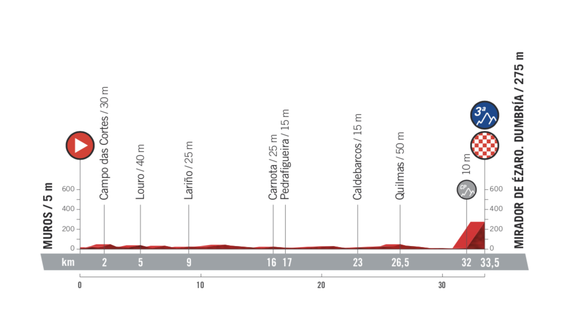 El plato fuerte sería una cronoescalada en el Mirador del Ézaro, perteneciente al ayuntamiento de Dumbría (A Coruña), que ya ha sido la meta en dos etapas en línea. Debutó en 2012 con el triunfo de Joaquim Rodríguez y repitió en 2016 con victoria para Alexandre Geniez. La subida consta de 1.800 metros y un 14.6% de desnivel medio, con rampas que alcanzan hasta el 29% en un tramo de hormigón.