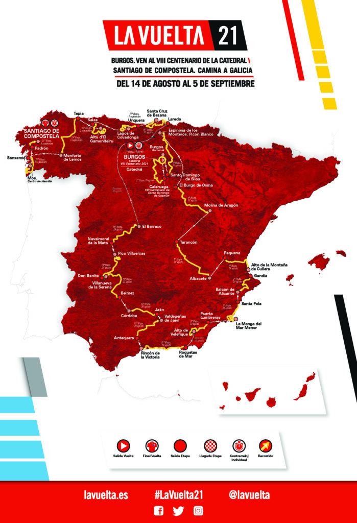 La 76ª edición de la Vuelta a España arrancará el día 14 de agosto en Burgos y finalizará el 5 de septiembre en Santiago de Compostela. De una catedral a otra en un bucle que, si el lector nos permite la herejía de la comparación, ofrece, en pleno año Xacobeo, un nuevo Camino de Santiago que, siendo más vuelta a España que nunca, dará la opción de inaugurar un nuevo Camino de los ciclistas.