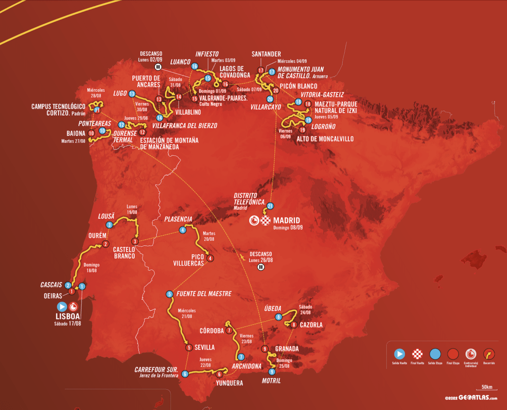 De Lisboa a Madrid, las dos capitales ibéricas, del 17 de agosto al 8 de septiembre, y de contrarreloj a contrarreloj individuales para vestir al primer portador del maillot rojo y al último y definitivo que suceda al sorprendente Sepp Kuss para cerrar un histórico círculo del Jumbo neerlandés ganando las tres grandes con los ocupantes finales del podio de Cibeles, Vingegaard y Roglic. La fuente de la diosa griega, madre de los dioses olímpicos, estará esta vez acompañada de cronómetros, bicicletas y cascos aerodinámicos, desfilando ante ella de uno en uno para recibir un año más a los tres mejores que deberán exprimirse hasta el último gramo de fuerza si las diferencias son exiguas ese domingo. Solo tres años después del éxito de Primoz Roglic en  Santiago de Compostela, una cronometrada no cierra la gran ronda española en su 79ª edición.