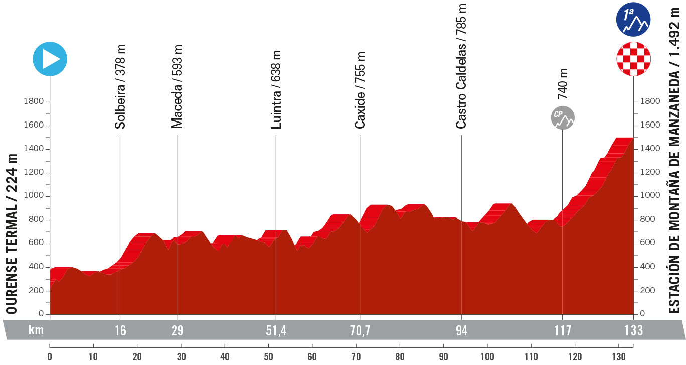 Los escapados deberían tener muchas opciones de victoria en esta sinuosa etapa con una primera parte por la Ribeira Sacra antes de encarar la ascensión final a la Estación de Montaña de Manzaneda. Si consiguen una buena renta a pie de puerto, los fugados se jugarán la victoria.