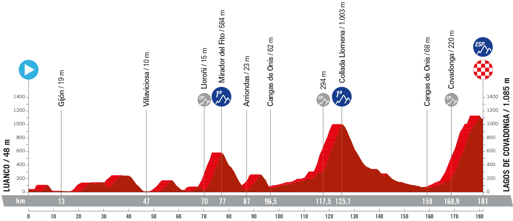 Lagos de Covadonga, una subida ya de sobra conocida por los ciclistas. Una etapa con kilometraje considerable que tendrá dos puertos de primera, Fito y Llomena, donde los escapados tendrán protagonismo antes de la subida final a los Lagos. Una etapa peligrosa al disputarse justo después del día de descanso, algún favorito podría pagarlo.