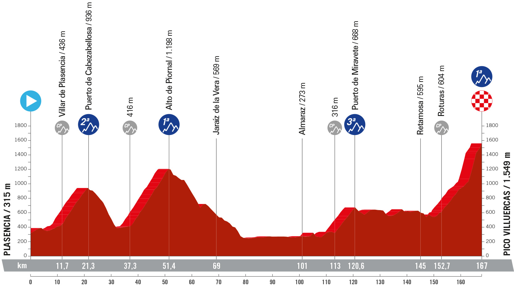 Primera etapa de montaña de esta edición, con 167 kilómetros y cuatro puertos puntuables. Complicada desde salida, un puerto de segunda y otro de primera en los primeros 50 kilómetros entre ellos el Piornal. La escapada será protagonista en estas primeras ascensiones previas a la subida final en el Pico Villuercas, con 3 kilómetros sobre cemento y rampas del 15-16%.