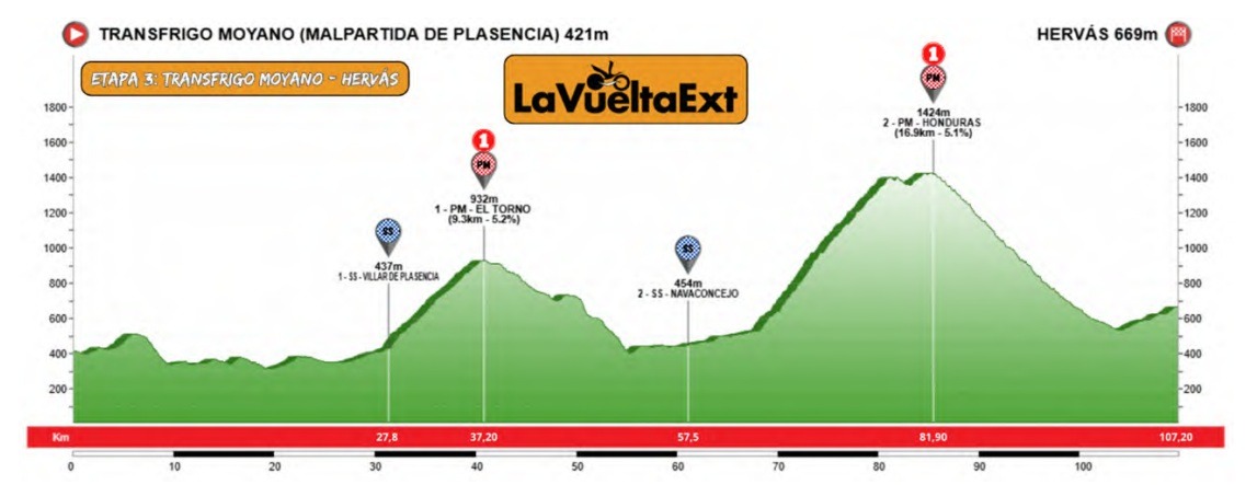 La del sábado, entre las instalaciones de Transfrigo Moyano y Hervás emerge como una de las grandes etapas de la temporada femenina por su recorrido de alta montaña en el Sistema Central. Los puertos de El Torno (1.000 m) y, especialmente, Honduras (1.431 m), un precioso puerto de montaña con casi diecisiete kilómetros de subida y una pendiente media cercana al 6%. Una etapa muy bien planteada.