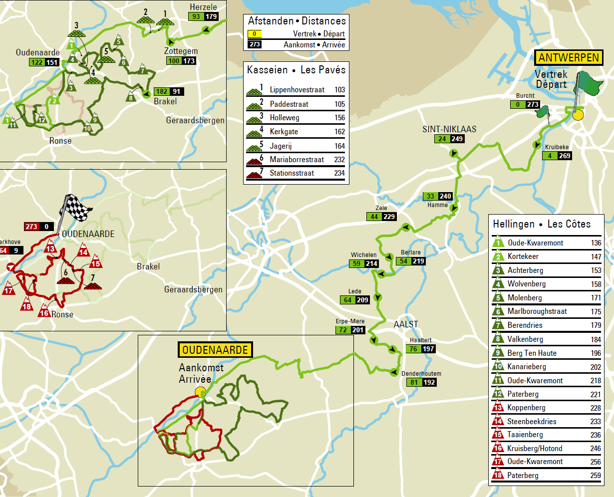 Sin rastro de la nieve que había caído los días anteriores, los corredores encaraban la 106ª edición de la Vuelta Flandes con un día soleado. Los ciclistas tenían 276 kilómetros por delante, el kilometraje más largo desde 1998, con un total de 18 muros y 7 tramos adoquinados que invitaban a disfrutar de un gran día de ciclismo. Sin la presencia de Wout Van Aert, el gran favorito, el número de candidatos a la victoria final aumentaba considerablemente. Uno de ellos, Tadej Pogacar, y todo un debutante en esta carrera, se cayó al suelo durante los primeros kilómetros. Se levantó sin aparentes problemas, más allá de unas leves molestias en la rodilla.