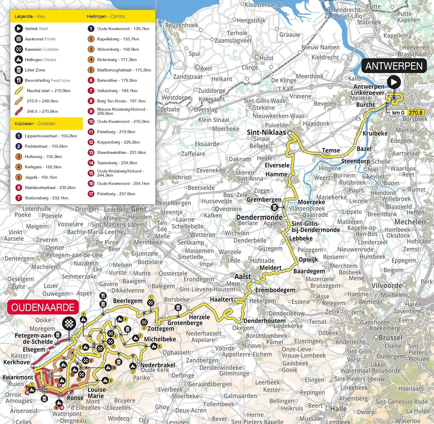 Tras ello, Alpecin controló la carrera para el gran favorito y nunca dejó a los ocho de cabeza ganar más de cuatro minutos, renta con la que llegaron al Viejo Kwaremont, donde se producía la primera caída, con un enganchón que afectaba ligeramente a Matej Mohoric. Las primeras colinas del día animaron pronto la carrera y permitieron ver los ataques de Jonas Abrahamsen y Axel Laurence en el Kapelleberg,Matteo Jorgenson en el Wolvenberg o, incluso, Mads Pedersen unos kilómetros después. El Lidl-Trek busco una nueva aceleración en el estrecho y empedrado Molenberg por medio de Jonathan Milan, lo que hizo aparecer por primera vez al principal favorito, Mathieu Van der Poel, que no quería sorpresas ante su posible día grande. De esta pequeña, pero explosiva colina salió un grupo de una decena de corredores, aunque el parón posterior animó a los Visma a lanzar por delante a Tim Van Dijke.