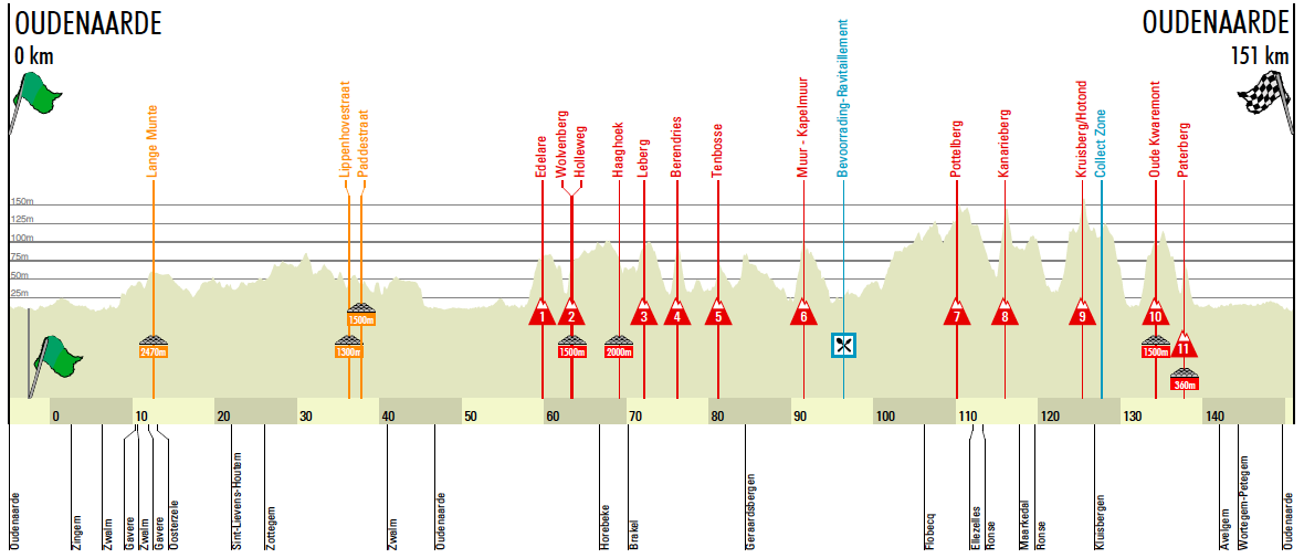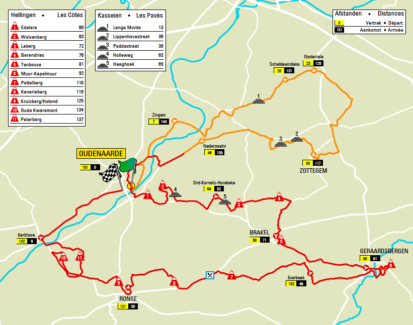 Será, por lo tanto, una edición ligeramente más corta que la del pasado año y en la que, como principal novedad, encontramos la desaparición del Achterberg, algo que, en cualquier caso, no afectará a la dureza de la carrera que, como hemos dicho, mantiene casi una docena de subidas en las que destacan el Muro y, por supuesto, el doblete Viejo Kwaremont-Paterberg que, situado a sólo 13 kilómetros de la línea de meta de Oudenaarde, será el lugar clave del día.