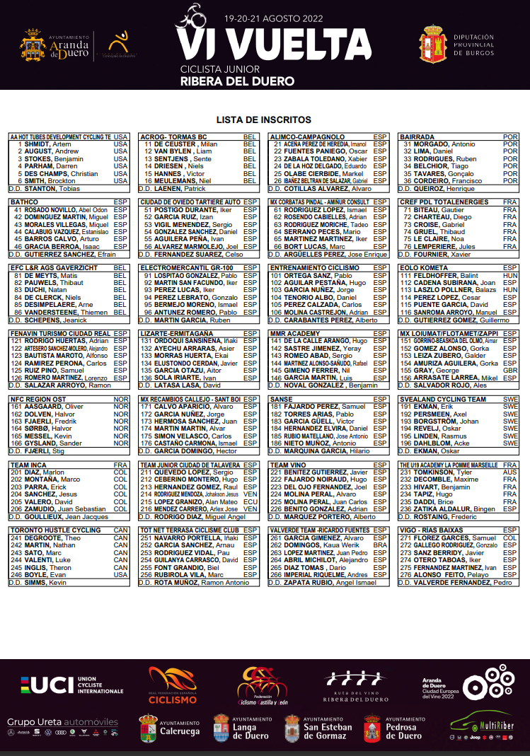 La VI edición de la Vuelta Júnior a la Ribera del Duero se disputa entre el 19 y el 21 de agosto en las carreteras de Burgos, Soria, Valladolid y Segovia, con pelotón de 28 escuadras encabezado por el conjunto estadounidense Hot Tubes. El equipo de USA, dominador de la última edición de la Vuelta Ribera y que se presenta con Artem Schmidt, tercer clasificado en la Vuelta Ribera 21 y subcampeón de EEUU Júnior tanto en contrarreloj como en ruta completará una nómina de una decena de escuadras internacionales procedentes de EEUU, Noruega, Canadá, Francia, Bélgica, Suecia y Portugal, que se medirán a los principales equipos nacionales y de Castilla y León. Además de los países de los equipos estarán representados por corredores en las diferentes escuadras hasta 15 nacionalidades, sumando Colombia, Venezuela, Ecuador, Brasil, Hungría, Gran Bretaña y Australia.