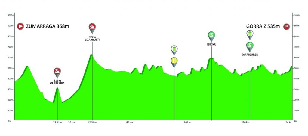 La etapa inaugural, que contará con un desnivel acumulado de 330,8 metros, comenzará en el número 12 de la calle Iparraguirre de Zumarraga y finalizará en esa misma localidad guipuzcoana. La salida aproximada del primer ciclista está prevista para las 14:15, mientras que la salida real del último corredor será a las 17:15 y su llegada para las 17:30.