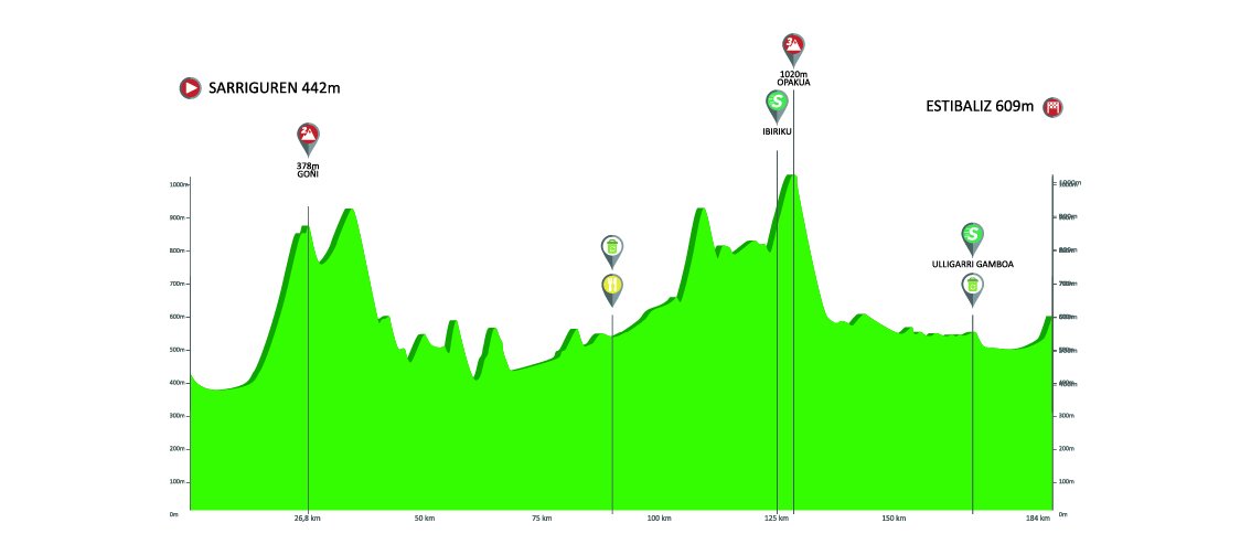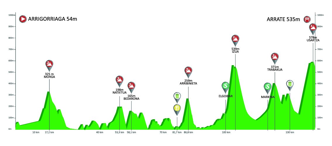 El 12 de abril se recorrerán 149,8 kilómetros en una jornada que comenzará en la calle Severo Ochoa de Arrigorriaga a las 13:40 y finalizará en Arrate entre las 17:19 y las 17:41. La etapa cuenta dos puntos de sprint intermedio y con nada menos que siete pasos en alto, Morga Gaina (3ª) Km 17,2. 4,1 Km – 5,7% – 231m; Natxitua Gaina (3ª) Km 53,3. 2,5 Km – 3,2% – 76m; Bedarona (3ª) Km 58,1. 2,1 Km – 7,4% – 148m; Arribinieta (3ª) Km 86,8- 2,8 Km – 7,4% – 208m; Izua Gaina (1ª) Km 110,2. 3 Km – 12,7% – 389m; Trabakua Gaina (3ª) Km 130,5: 6 Km – 4,4% – 266m; y Usartza Gaina (1ª) Km 147,6. 5 Km – 8,8% – 429m.