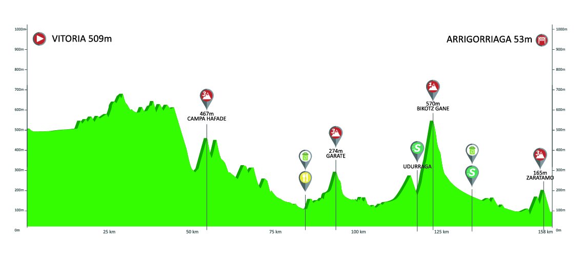 El 11 de abril se recorrerán 164,1 kilómetros en una jornada que comenzará en el parque Mendizabala de Vitoria a las 13:12 y finalizará en Arrigorriaga entre las 17:18 y las 17:42. La etapa cuenta con un par de sprints y cuatro puertos, Campa Hafade (3ª) Km 56,4. 3,1 Km – 5,8% – 176m; Garate Gaina (3ª) Km 96,8. 1,5 Km – 6,2% – 94m; Bikoitz Gane (1ª) Km 127,3. 4,9 Km – 8,6% – 420m; y Zaratamo Gaina (3ª) Km 161,4 Km – 3,2% – 129m.