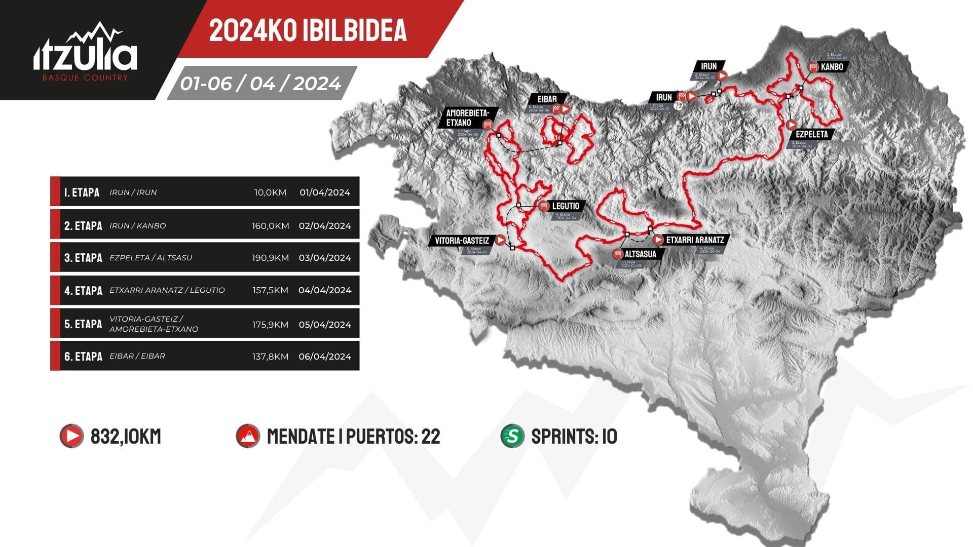 Irún acogerá la salida y en Éibar estará situado el final después de completar un total de seis etapas. La 63º edición de la carrera visitará las localidades de Irún, Kanbo, Ezpeleta, Altsasu, Etxarri Aranatz, Legutio, Vitoria-Gasteiz, Amorebieta-Etxano y Éibar, recorriendo 833,6 kilómetros a lo largo de las seis jornadas. Será Gobik la encargada de vestir a los ganadores de la Itzulia. En esta edición de 2024 comprende hasta cuatro diseños, destacando el amarillo para el ganador patrocinador por el Banco Sabadell, el de montaña (Eusko Label), regularidad (Diputación Foral de Gipuzkoa) y joven (Euskadi Basque Country).