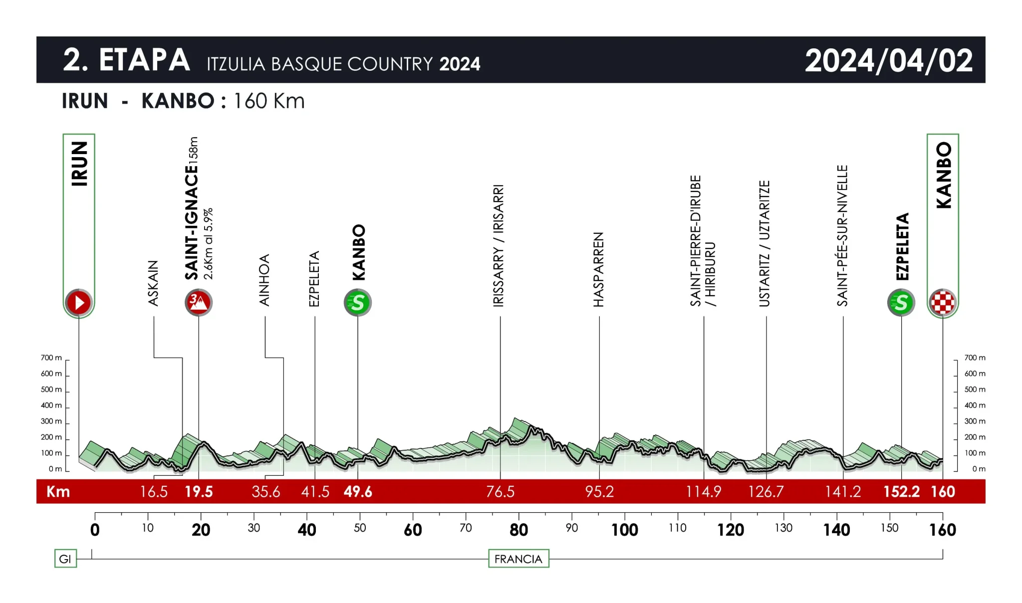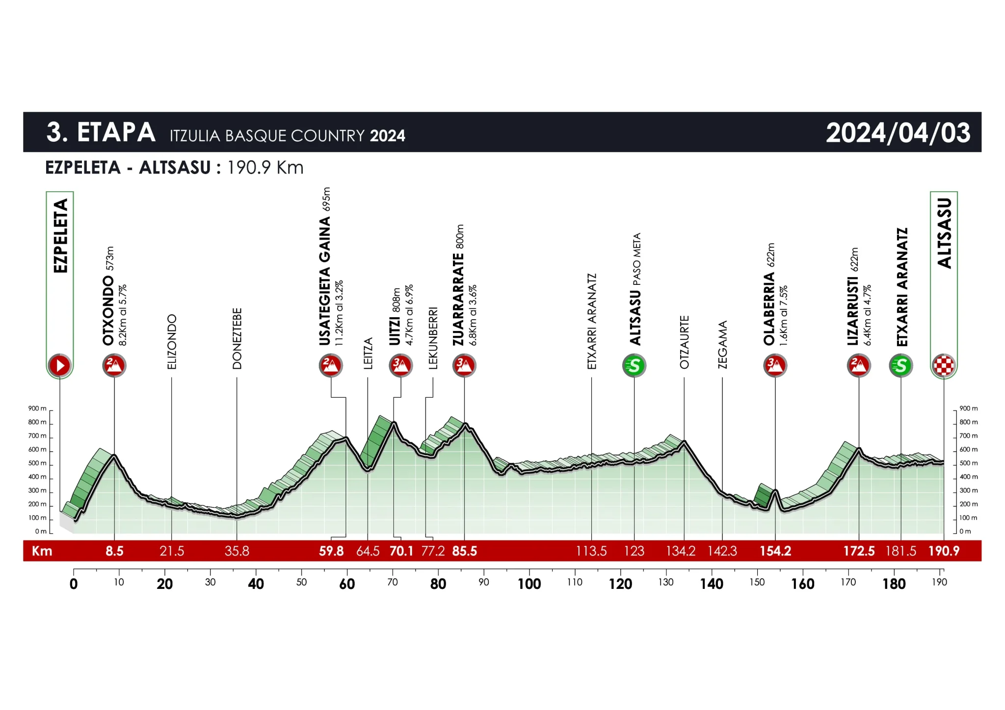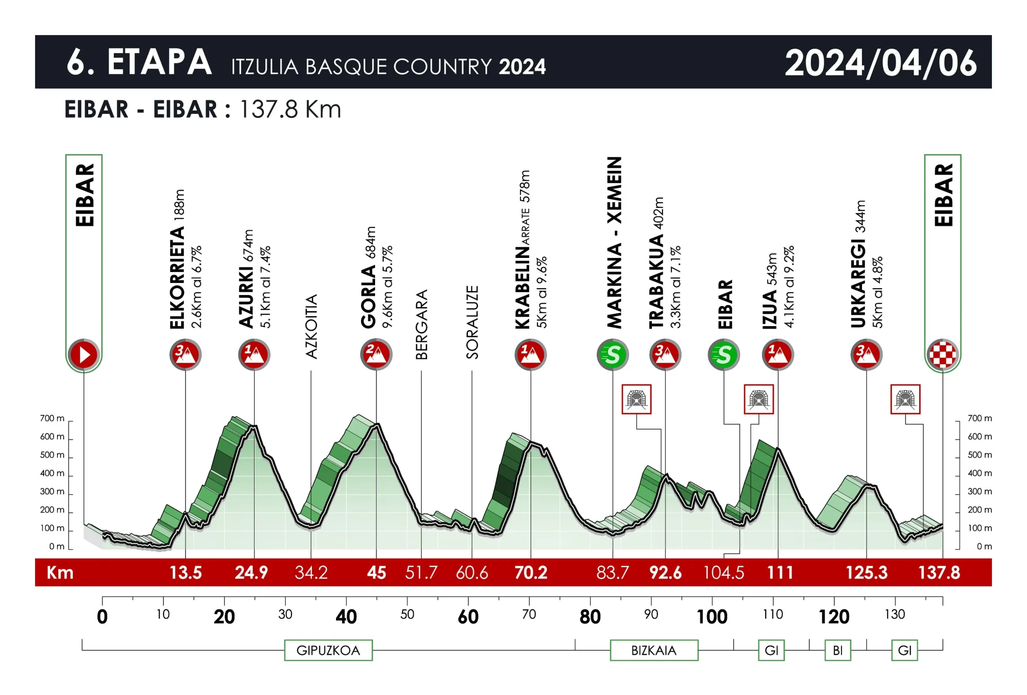 La etapa más larga de la edición de 2024 y además con 6 puertos de montaña puntuables. Prácticamente a balón parado comenzarán la subida a Otxondo, un buen sitio para que una fuga fuerte y numerosa pueda abrir camino. Las dos últimas subidas podrán definir el grupo que llegará a meta en cabeza.