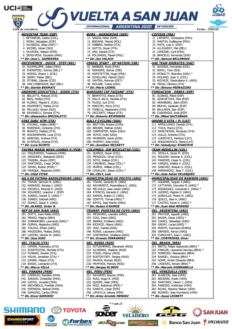 01 Fernando Gaviria1994 UAE Team Emirates02:58:03 02 Peter Sagan1990 Bora – Hansgrohe+ 00 03 Alvaro Hodeg1996 Deceuninck – Quick Step+ 00 04 Manuel Belletti1985 Androni Giocattoli – Sidermec+ 00 05 Hugo Hofstetter1994 Israel Start-Up Nation+ 00 06 Rudy Barbier1992 Israel Start-Up Nation+ 00 07 Davide Appollonio1989 Amore & Vita – Prodir+ 00 08 Sebastian Mora1988 Movistar Team+ 00 09 Nelson Soto1994 Colombia Tierra de Atletas-GW+ 00 10 Marco Benfatto1988 Bardiani – CSF – Faizanè+ 00 11 Piet Allegaert1995 Cofidis+ 00 12 Mikel Alonso Flores1996 Fundacion-Orbea+ 00 13 Robinson Ruiz Calle1998 Peru + 00 14 Cesar Martingil1995 Atum General-Tavira- Maria Nova Lou+ 00 15 Umberto Marengo1992 Vini Zabù – KTM+ 00 16 Jonathan Milan2000 Italy + 00 17 Lucas Manuel Gaday1993 Argentina + 00 18 Alain Quispe1994 Peru + 00 19 Nicolas Naranjo1990 Asoc.Civil Agrup.Virgen de Fátima+ 00 20 Bert Van Lerberghe1992 Deceuninck – Quick Step+ 00 21 Alessandro Guimaraes1995 Brazil + 00 22 Roman Maikin1990 Russia + 00 23 Tomas Contte1998 EC Municipalidad de Pocito+ 00 24 Sergei Rostovcev1997 Russia + 00 25 Maris Bogdanovics1991 Amore & Vita – Prodir+ 00 26 Jokin Aranburu Arruti1997 Fundacion-Orbea+ 00 27 Maximiliano Richeze1983 UAE Team Emirates+ 00 28 Luca Wackermann1992 Vini Zabù – KTM+ 00 29 Mauro Richeze1985 Transporte Puertas del Cuyo+ 00 30 Daniel Oss1987 Bora – Hansgrohe+ 00 31 Mamyr Stash1993 Russia + 00 32 Aleksandr Grigoriev1992 Atum General-Tavira- Maria Nova Lou+ 00 33 Maximiliano Navarrete1991 EC Municipalidad de Pocito+ 00 34 Guillaume Martin 1993 Cofidis+ 00 35 Remco Evenepoel 2000 Deceuninck – Quick Step+ 00 36 Alejandro Marque1981 Atum General-Tavira- Maria Nova Lou+ 00 37 Fernando Barceló1996 Cofidis+ 00 38 Ricardo Escuela1983 Asoc.Civil Agrup.Virgen de Fátima+ 00 39 Simone Ravanelli1995 Androni Giocattoli – Sidermec+ 00 40 Miguel Florez1996 Androni Giocattoli – Sidermec+ 00 41 Cesar Paredes1992 Team Medellin+ 00 42 Diego Andres Camargo1998 Colombia Tierra de Atletas-GW+ 00 43 Leonardo Rodriguez1998 Municipalidad de Rawson+ 00 44 Anderson Paredes1995 Venezuela + 00 45 Oscar Bazan1999 Argentina + 00 46 Mattia Frapporti1994 Androni Giocattoli – Sidermec+ 00 47 Omar Mendoza1989 Colombia Tierra de Atletas-GW+ 00 48 Royner Navarro1992 Peru + 00 49 Oscar Gatto1985 Bora – Hansgrohe+ 00 50 Maximo Rojas1983 Venezuela + 00 51 Vinicius Rangel Costa2001 Brazil + 00 52 Nicolas Tivani1995 Asoc.Civil Agrup.Virgen de Fátima+ 00 53 Ruben Ramos1992 EC Municipalidad de Pocito+ 00 54 Franklin Archibold1997 Panama + 00 55 Jeison Ferney Casallas2000 Colombia Tierra de Atletas-GW+ 00 56 Renzo Obando2000 Argentina + 00 57 Frederico Figueiredo1991 Atum General-Tavira- Maria Nova Lou+ 00 58 Alexander Evtushenko1993 Russia + 00 59 Hugo Nestor Ruiz Calle1996 Peru + 00 60 Jose Reyes1992 EC Municipalidad de Pocito+ 00 61 Simon Pellaud1992 Androni Giocattoli – Sidermec+ 00 62 Brandon McNulty1998 UAE Team Emirates+ 00 63 Johan Jacobs1997 Movistar Team+ 00 64 Mattia Bais1996 Androni Giocattoli – Sidermec+ 00 65 Laureano Rosas1990 Transporte Puertas del Cuyo+ 00 66 Clever Martinez Moros1990 Venezuela + 00 67 Randish Abdul Lorenzo1997 Panama + 00 68 José Rujano1982 Venezuela + 00 69 Iker Ballarin Manso1997 Fundacion-Orbea+ 00 70 Unai Cuadrado Ruiz de Gauna1997 Fundacion-Orbea+ 00 71 Juan Pablo Dotti1984 SEP San Juan+ 00 72 Óscar Sevilla1976 Team Medellin+ 00 73 Zdenek Stybar1985 Deceuninck – Quick Step+ 00 74 Leonardo Basso1993 Italy + 00 75 Juan Melivillo1989 EC Municipalidad de Pocito+ 00 76 Alessandro Tonelli1992 Bardiani – CSF – Faizanè+ 00 77 Ruben Simao2000 Atum General-Tavira- Maria Nova Lou+ 00 78 Nelson Oliveira1989 Movistar Team+ 00 79 Eduin Becerra1985 Venezuela + 00 80 Jose Tito Hernandez1994 Team Medellin+ 00 81 Walter Vargas1992 Team Medellin+ 00 82 Brayan Sanchez1994 Team Medellin+ 00 83 Garikoitz Bravo1989 Fundacion-Orbea+ 00 84 Matteo Fabbro1995 Bora – Hansgrohe+ 00 85 Viesturs Luksevics1987 Amore & Vita – Prodir+ 00 86 Inigo Elosegui1998 Movistar Team+ 00 87 Filippo Ganna1996 Italy + 00 88 Michele Scartezzini1992 Italy + 00 89 Jose Alarcon1988 Venezuela + 00 90 Alexi Andy Limaylla Zevallos1990 Peru + 00 91 Leandro Messineo1979 Transporte Puertas del Cuyo+ 00 92 Marco Tizza1992 Amore & Vita – Prodir+ 00 93 Kevin Castro1999 Municipalidad de Rawson+ 00 94 Andrea Garosio1993 Vini Zabù – KTM+ 00 95 Norman Vahtra1996 Israel Start-Up Nation+ 00 96 Andrea Di Renzo1995 Vini Zabù – KTM+ 00 97 Pawel Poljanski1990 Bora – Hansgrohe+ 00 98 Carlos Betancur1989 Movistar Team+ 00 99 Luis Angel Mate1984 Cofidis+ 00 100 Alvaro Trueba1993 Atum General-Tavira- Maria Nova Lou+ 00 101 Leonardo Henrique Finkler1999 Brazil + 00 102 Carlos Ariel Samudio1997 Panama + 00 103 Gabriel Juarez1990 Asoc.Civil Agrup.Virgen de Fátima+ 00 104 Jorge Amadid Castelblanco Morales1988 Panama + 00 105 Sebastian Molano1994 UAE Team Emirates+ 00 106 Oscar Gomez1981 Asoc.Civil Agrup.Virgen de Fátima+ 00 107 Matvei Mamykin1994 Russia + 00 108 Gavin Mannion1991 Rally Cycling+ 00 109 Matteo Busato1987 Vini Zabù – KTM+ 00 110 Andre Gohr1996 Brazil + 00 111 Sergio Aguirre1976 Municipalidad de Rawson+ 00 112 Vladimir Ilchenko1996 Russia + 00 113 Peio Goikoetxea Goiogana1992 Fundacion-Orbea+ 00 114 Cyril Lemoine1983 Cofidis+ 00 115 Riccardo Marchesini1993 Amore & Vita – Prodir+ 00 116 Alejandro Quilci1987 Municipalidad de Rawson+ 00 117 Patrick Schelling1990 Israel Start-Up Nation+ 00 118 Colin Joyce1994 Rally Cycling+ 00 119 Nicolas Dalla Valle1997 Bardiani – CSF – Faizanè+ 00 120 Travis McCabe1989 Israel Start-Up Nation+ 00 121 Alejandro Duran1991 SEP San Juan+ 00 122 Daniel Diaz1989 Transporte Puertas del Cuyo+ 00 123 Antonio Zullo1993 Amore & Vita – Prodir+ 00 124 Maciej Bodnar1985 Bora – Hansgrohe+ 00 125 Eduardo Sepulveda1991 Movistar Team+ 00 126 Matias David Maggiora1993 SEP San Juan+ 00 127 William Munoz1994 Colombia Tierra de Atletas-GW+ 00 128 Efraín Toloza1995 SEP San Juan+ 0