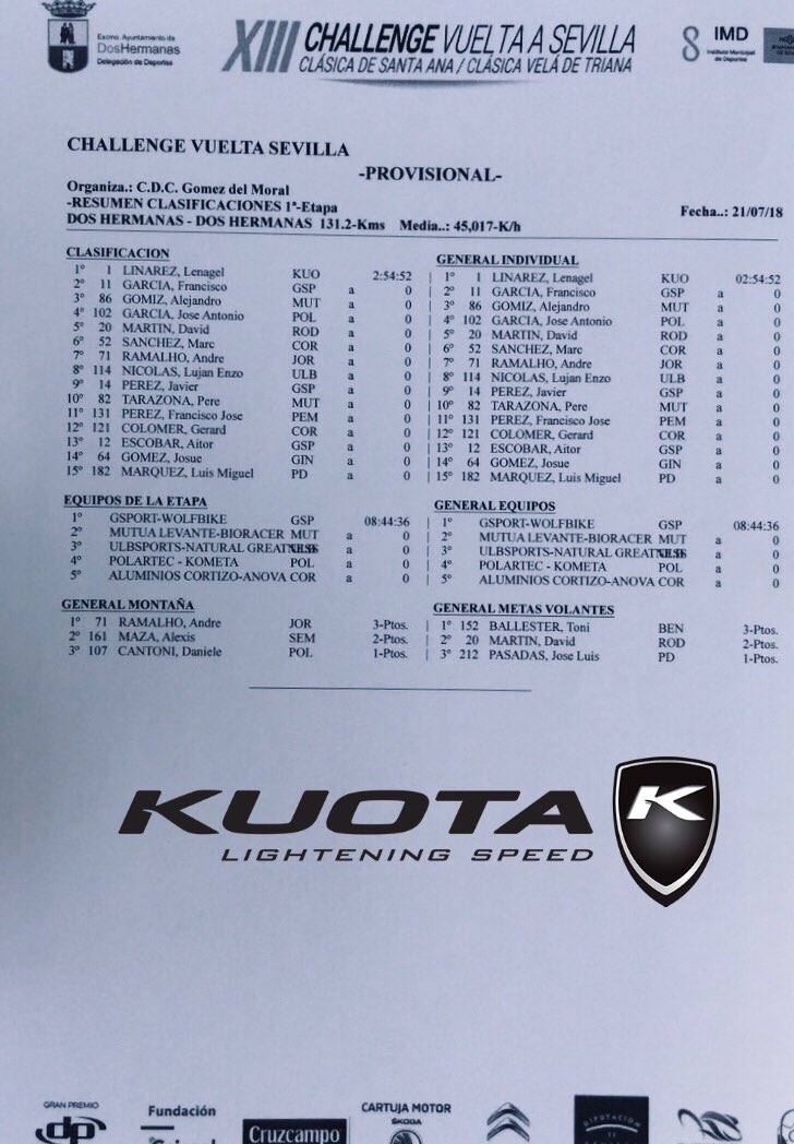 Leángel Linarez (Team Kuota) se ha llevado al sprint el triunfo en la Clásica Santa Ana, primera prueba de la XIII Challenge Vuelta a Sevilla, con lo que el venezolano, vencedor de la pasada edición, se viste como líder.